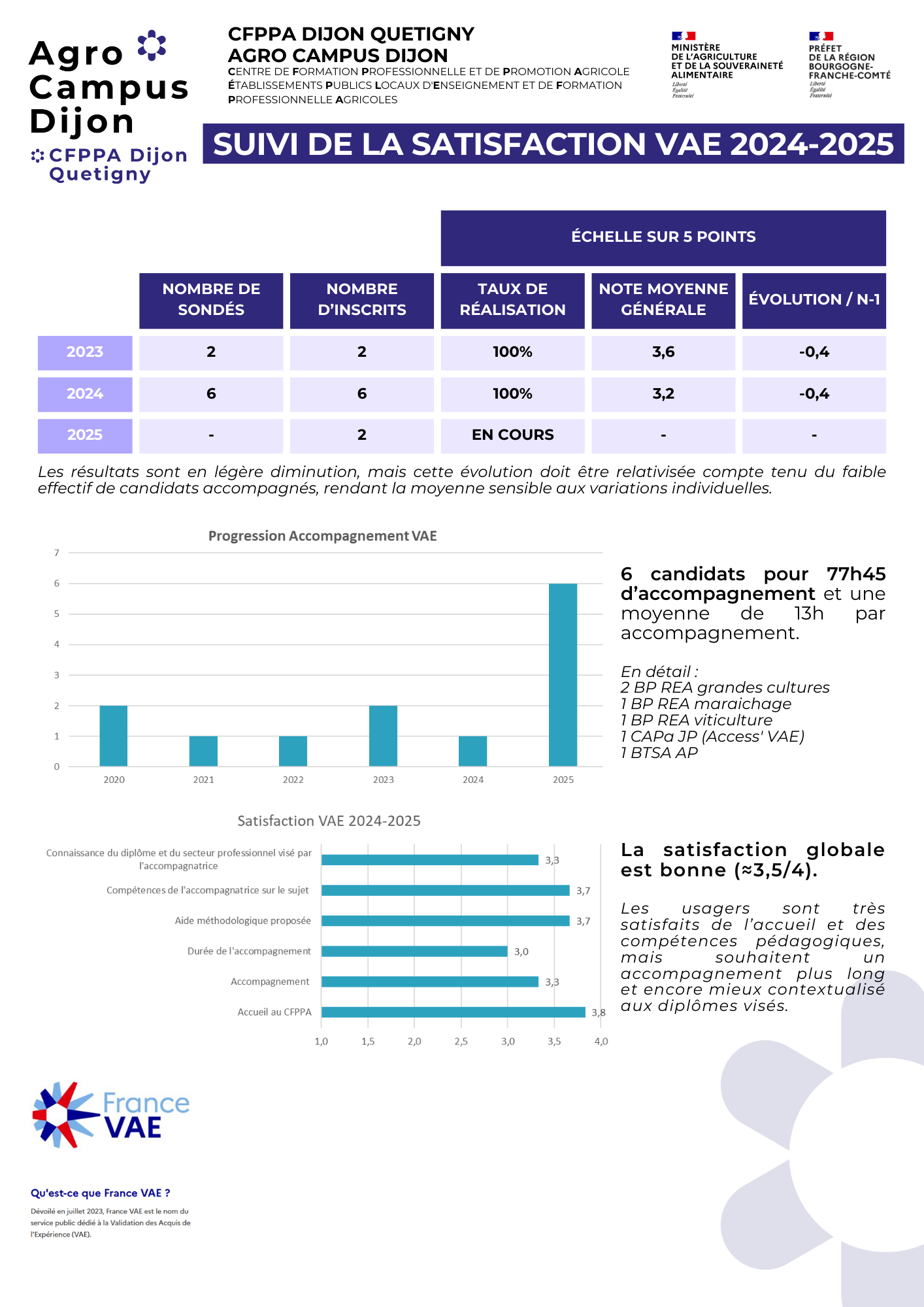 La VAE s'adresse à toutes personnes qui souhaite valider les acquis de son expérience pour obtenir un diplôme relevant du Ministère de l’Agriculture, de l’Agroalimentaire et de la Souveraineté Alimentaire (du niveau 3 au niveau 5). Le CFPPA assure une prestation d’accompagnement à la Validation des Acquis de l’Expérience.
